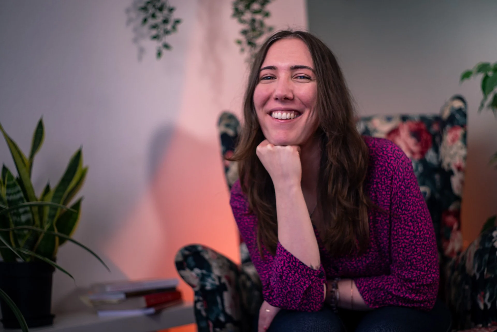 A smiling woman with long brown hair, wearing a purple patterned top, sitting in a floral armchair with her chin resting on her hand. There are potted plants and books on a table beside her.